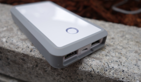 筐体の前面には出力用USBポート、充電用USBポート、LEDライトが並んでいます。本体上部には残量を示すLED、側面には、充電を開始したり残量確認をするためのボタンがついています。