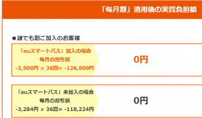 このパケット定額サービスは、対象機種が限定されている上、申し込みから3年間限定ではありますが、データ量1GB/月額2680円とデータ定額1よりわずかながら割安で、LTEプランとの組み合わせが可能なため、LTE NETも合わせて月額3914円からauスマートフォンが利用できるというメリットがあります。また注目すべきは、このサービスが毎月割やauスマートバリュー(永年月額934円割引)の適用対象であるという点です。スマートバリューを申し込めば、端末代金も含めて月額2980円から利用できます。同じau回線を利用するMVNO、UQ mobileの「ぴったりプラン」と同額です。