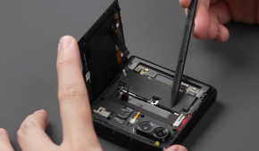 画像では、背面カメラやLEDすら一般的なインカメラのパンチホールのような扱いになるほど大型化したスクリーンが背面を覆っているのが分かります。UIから、カメラが下になるような向きでの利用を想定しているようで、カメラ左側のスペースには各種通知やバッテリー残量などが表示されています。
