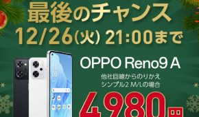 Y!mobileにて、3万1680円の「OPPO Reno9 A」が機種変更特別優待の対象となっています。