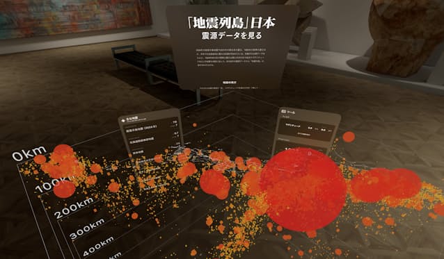 日本経済新聞社がVision Pro向けのアプリを出しているのですが、これが非常に面白いです。有料版では記事が読めたりするのですが、そうではなく無料版でも提供されている「地震列島」日本というコンテンツです。これはVision Proならではというコンテンツで、ぐるぐる自分が動いたり、指で動かしたり。こういうデータを視覚化するとまるでエヴァンゲリオンNERV本部で行われていた会議のホログラムのようなSF感があり非常に楽しいです。