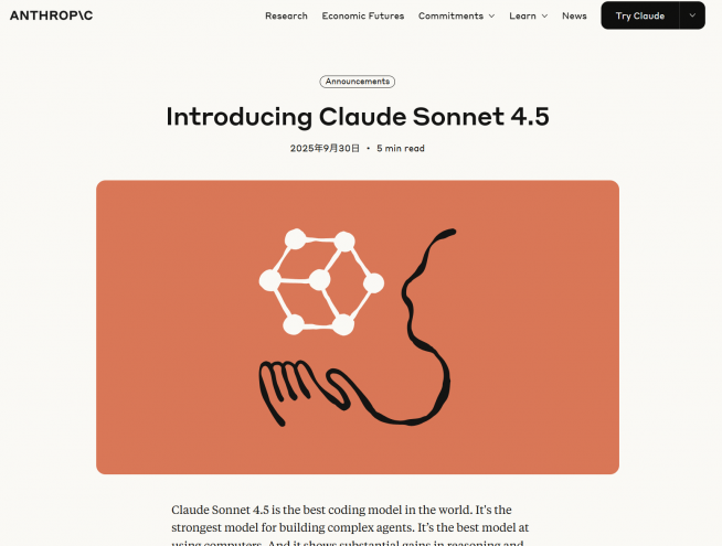 Anthropicは新しい大型言語モデル「Claude Sonnet 4.5」を発表しました。コーディングや長時間にわたる自律的な作業(エージェント運用)を念頭に開発、既に企業向けの評価や導入パートナーでの利用が始まっているとしています。