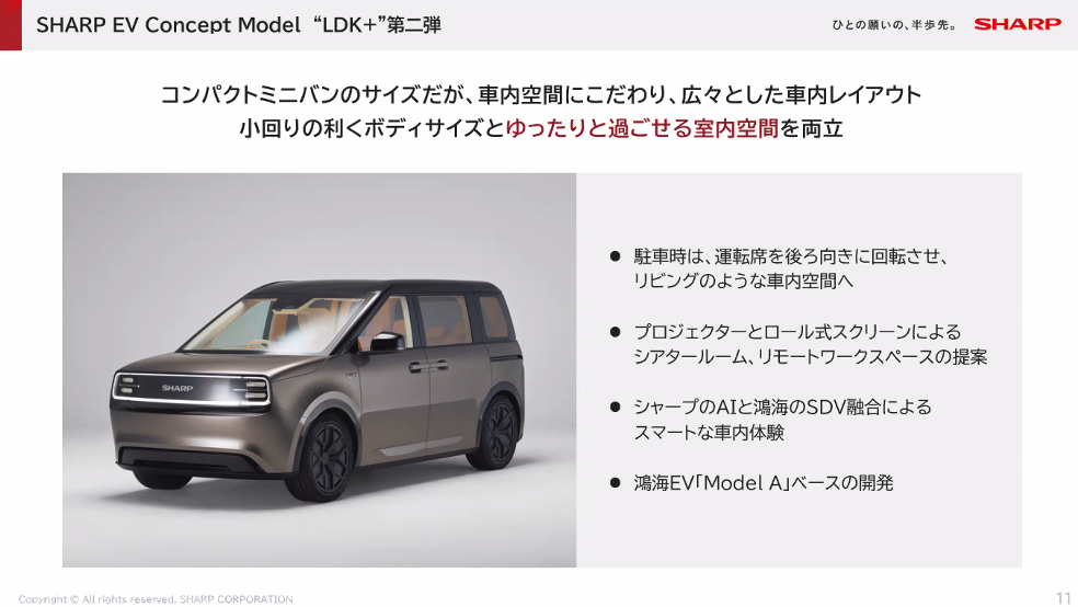 第2弾は鴻海Model Aをベースモデルとしてシャープがカスタマイズした5人乗りの電気自動車に。プロジェクターや回転式の椅子などが差異です。
