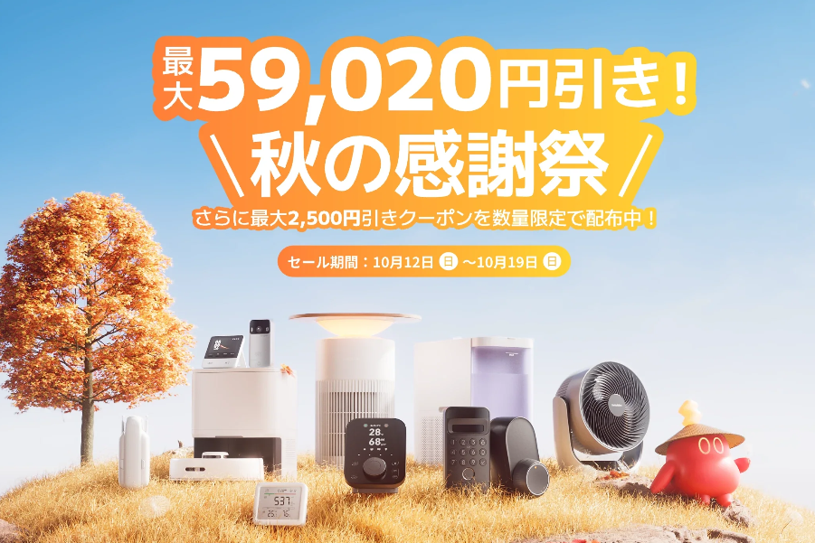 SWITCHBOT株式会社は、公式ストアで「秋の感謝祭」セールを2025年10月12日(日)0:00から10月19日(日)23:59まで開催します。最大割引額は5万9020円で、対象製品はロボット掃除機やスマート照明、スマートリモコンなど幅広いラインアップに及びます。