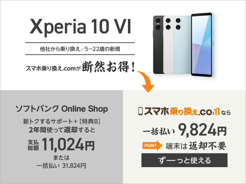 ソフトバンク正規代理店「スマホ乗り換えドットコム」は、ソニー製スマートフォン「Xperia 10 VI」をセール中です。