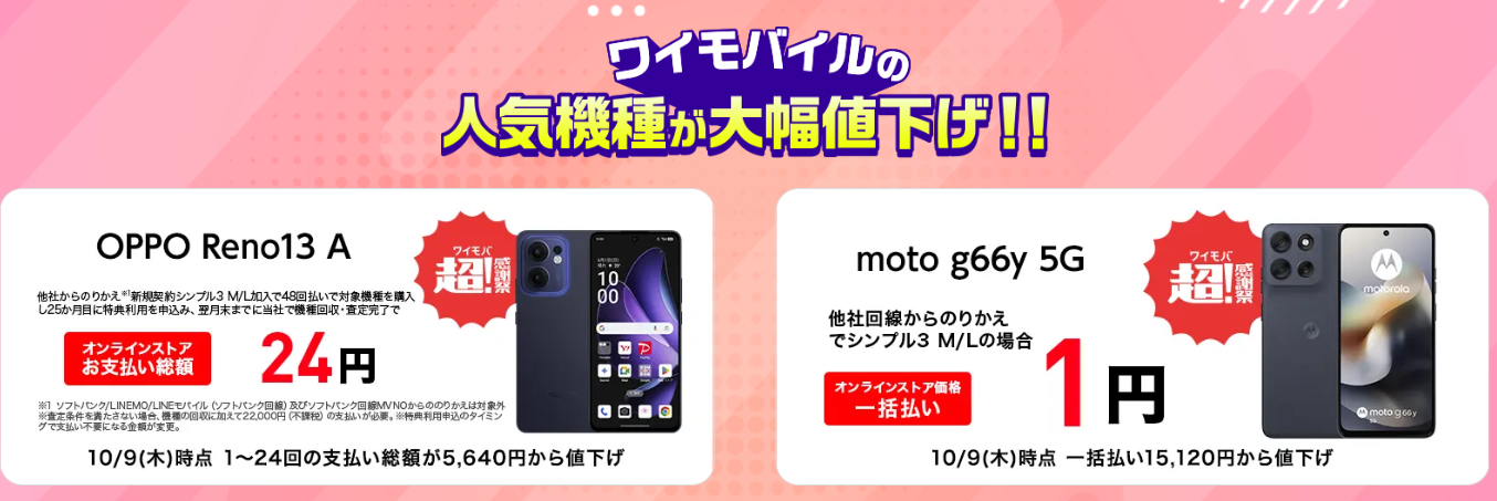 ソフトバンクは、ワイモバイルオンラインストアにて「OPPO Reno13 A」「moto g66y 5G」「iPhone SE 第3世代 (ソフトバンク認定中古品)」の3機種を値下げしました。