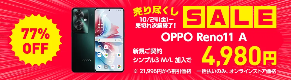 OPPO Reno11 Aは、新規でシンプル3 M/Lを契約した場合の端末支払総額が一括4980円となり、77%オフを謳います。