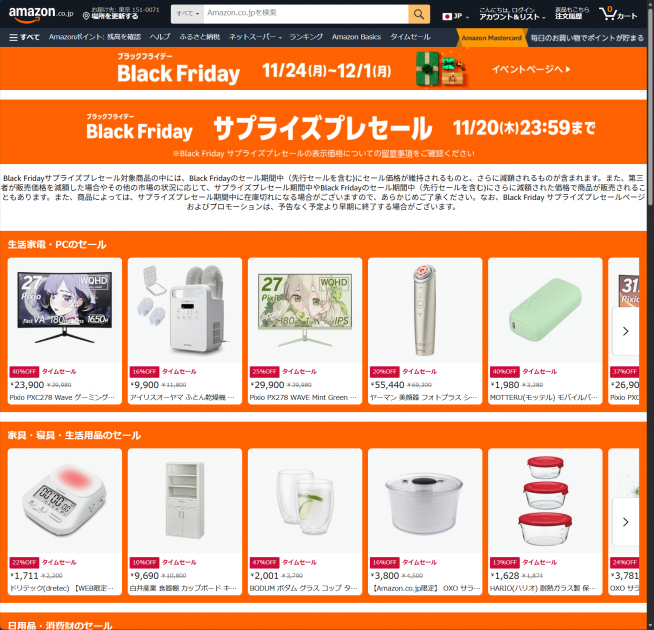 Amazon.co.jpは、ブラックフライデーセールに先駆け、「ブラックフライデー サプライズプレセール」なるものを開始しました。