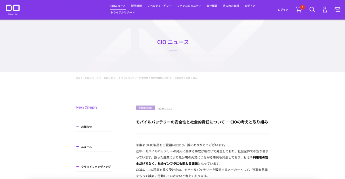 CIOは背景として、近年相次ぐモバイルバッテリー関連の事故や廃棄時の火災リスクの高まりを挙げ、メーカーとしての社会的責任を強調。2025年1月からは一部ロットの自主回収対応を進めるなど、製品寿命や適切な買い替え/回収サイクルに関する啓発も継続しているそうです。