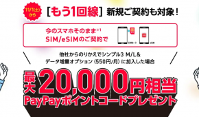定価は2万1996円。条件はシンプル3 MまたはLへの申込で、新規契約時は一括9800円、そして他社からのりかえ(MNP)時に一括1円になっています。シンプル3 SのMNPでも3996円です。