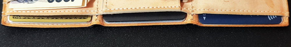 3つのポケットがあり、各2枚づつ収納。計6枚のカードが入ります。慣らしていくと各3枚、計9枚入るようになってました。紛失防止タグなどを入れる余裕も十分あります。収納力は高いです。