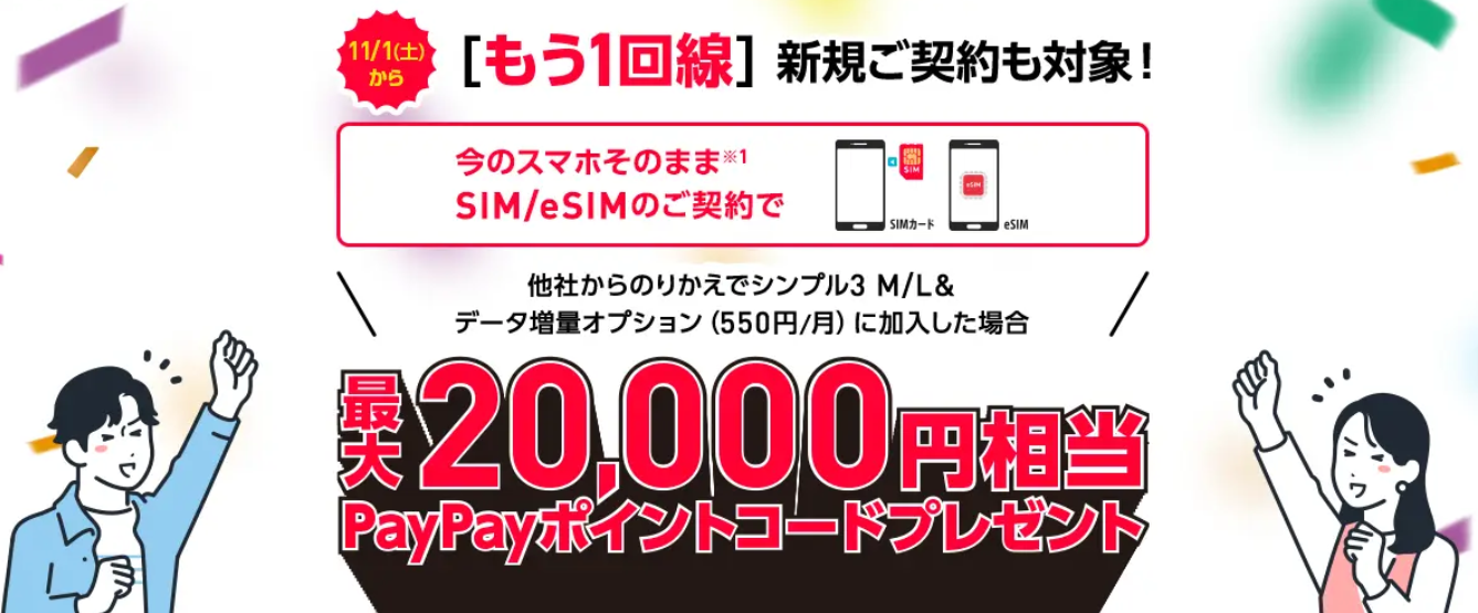 ワイモバイルオンラインストアは、SIM/eSIM単体契約にて、条件を満たすと最大2万円相当のPayPayポイントコードを進呈します。対象は他社からのりかえでシンプル3 M/Lを契約し、データ増量オプション(550円/月)に加入した場合で、進呈額は2万円相当となります。