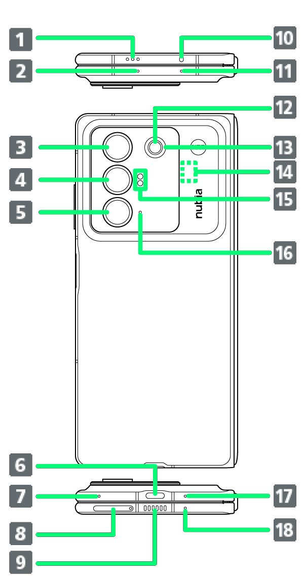 外側画面には中央パンチホールのインカメラ搭載。上下のスピーカー、SIMトレイ、マイク、USB Type-Cポートの位置関係も読み取れます。