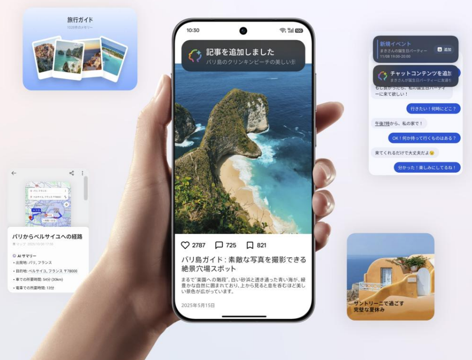 ソフトウェアは「ColorOS 16」で、「O+ Connect」機能によりiPhoneへの着信応答などにも対応します。また、AI機能「AIマインドスペース」は、スクリーンショットや音声メモから情報を自動で要約・分類し、カレンダー登録などをサポートします。