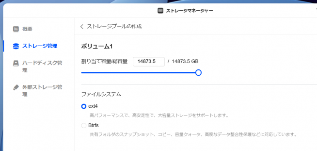 RAID構成が決まったら、あとはボリュームの作成とファイルシステムの選択です。UGREENのウィザードでは、まず「このストレージプールを何GBに割り当てるか」というスライダーが出てきますが、今回はシンプルに、RAID6で確保できる容量をまるごと「ボリューム1」に割り当てました。