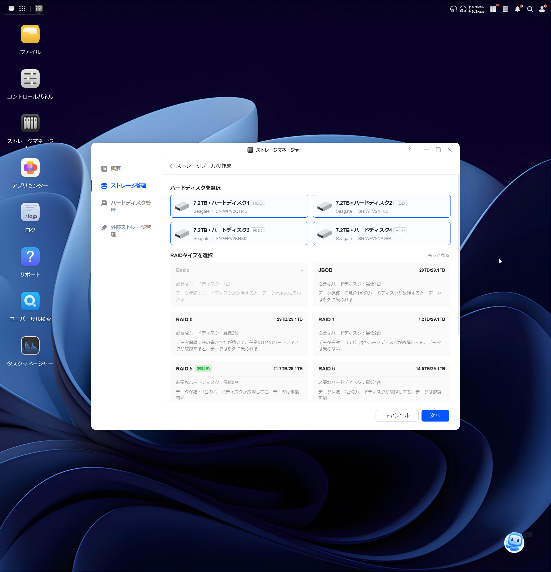 | 対応RAID | Basic、JBOD、RAID0、RAID1、RAID5、RAID6、RAID10 |