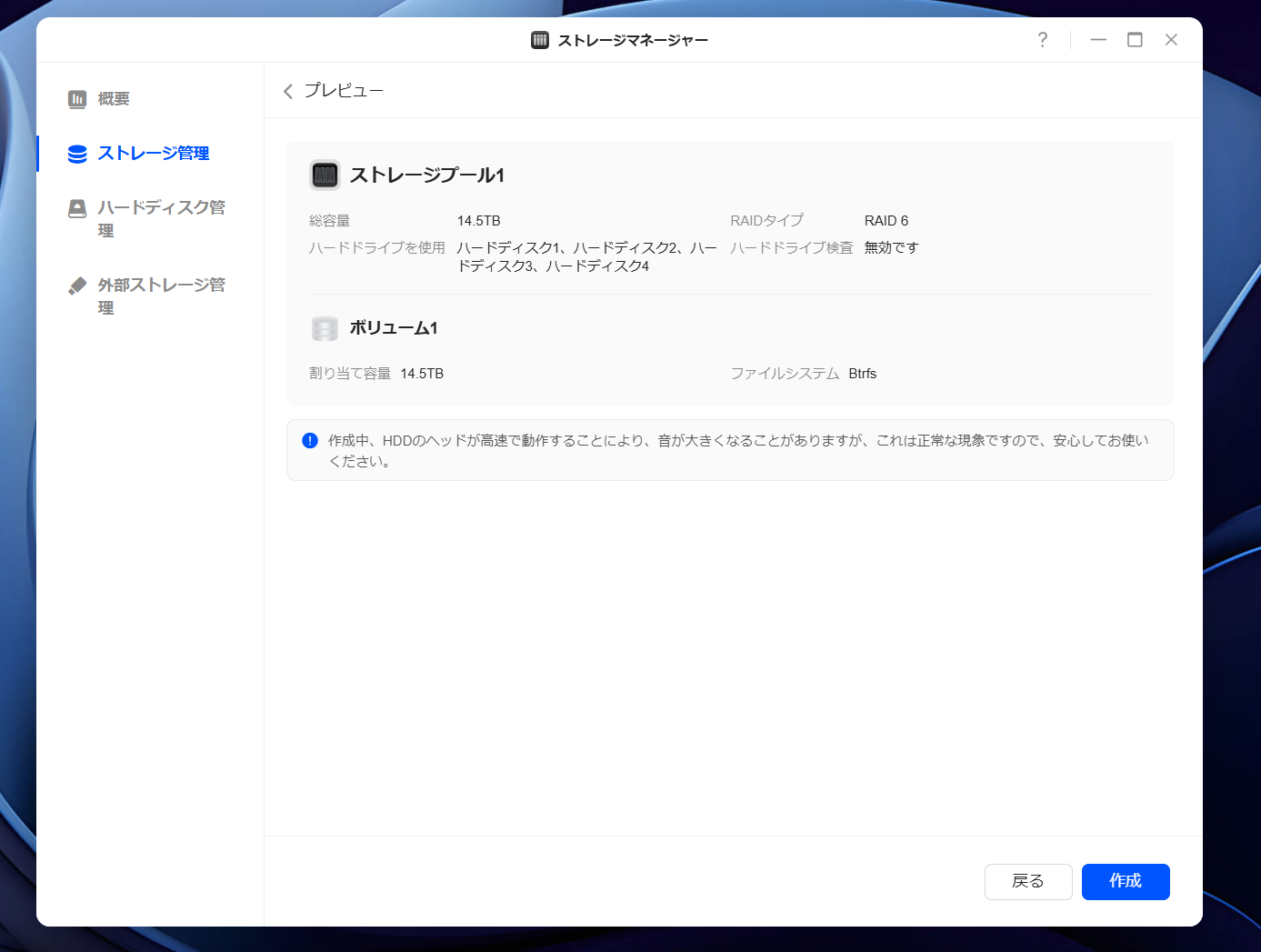 なお初期設定時には8TB×4だけあって相当な時間が必要で、11時間ほど掛かりました。NAS側が勝手に処理してるだけで、その間にPC側で何かすべきことは特になし。