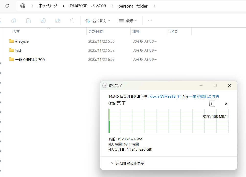 設定でSMBを有効化してWindowsのファイラーからファイルを転送できるようにしてみました。Btrfsでデータチェックサム、スナップショット対応など安全性を重視したことで、オーバーヘッドが少し増えてext4よりわずかに重いか?と思ったのですが、一眼で撮影した写真をNASに送ってみたところ、110Mb/sほど。速度はファイラーやNASの画面右上の表示から確認できます。1GbE理論値125MB/s辺りがボトルネックになるから速度はこんなもんですかね。