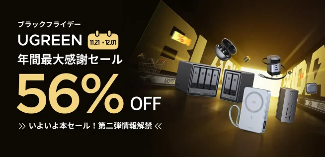 Amazon.co.jpでは「UGREEN ブラックフライデー第二弾」として、NASからワイヤレスイヤホン、モバイルバッテリー、ドッキングステーションまで最大56%オフになるセールを開催しています。