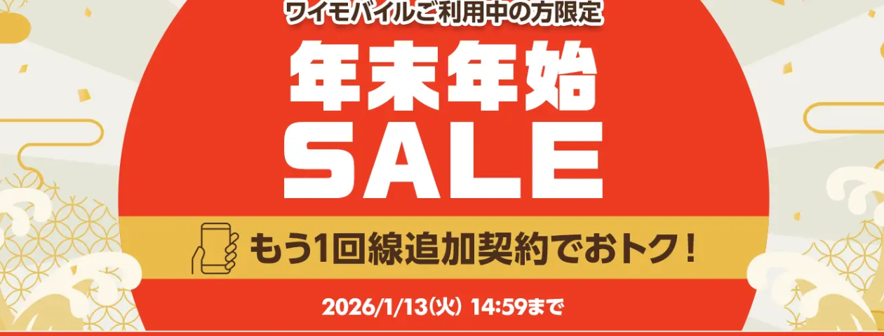 Y!mobileのオンラインストアで、既存ユーザーを対象にした年末年始セールが始まっています。追加回線の新規契約を行うと、通常は発生する新規契約事務手数料3850が無料になるのが最大の特徴です。期間は2026年1月13日14時59分までとなっています。