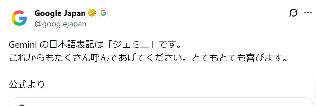 Google Japan公式Xアカウントは、GoogleのAI「Gemini」の日本での正式な発音・読み方が「ジェミニ」であることを改めて確認しました。