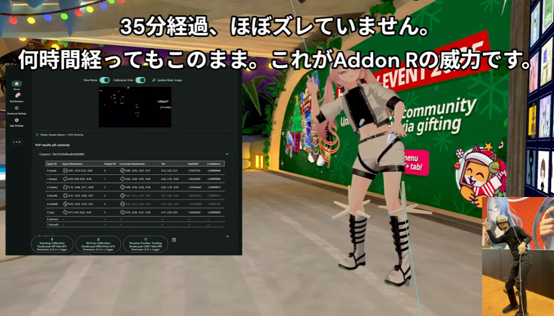 HaritoraX 2はIMU方式のため、センサーに死角がなく姿勢によるトラッキングロストが起きにくい一方、長時間使用でアバターがねじれていく「ドリフト」が課題でした。Add-on Rはこのドリフトを、カメラによって自動補正する狙いです。
