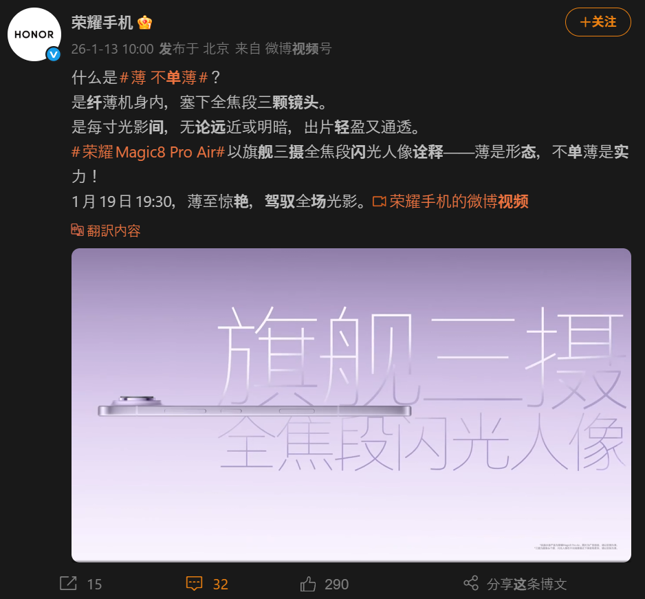 HONORが「Magic 8 Pro Air」を2026年1月19日19時30分に中国で発表すると予告しました。薄型軽量なのに「Pro級」を謳うのが特徴です。