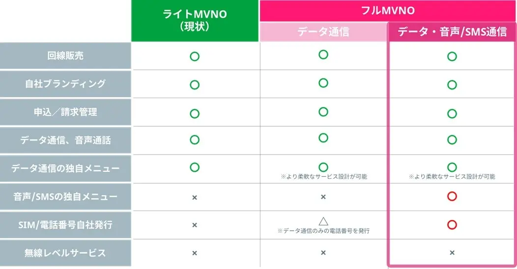 一般に多くのMVNO事業者は、通信設備の大部分をMNOから借り受けてサービスを提供する「ライトMVNO」と呼ばれます。これに対しmineoは、加入者管理装置(独自SIMおよび電話番号の管理)やデータ交換機、音声/SMS交換機を自社保有することで、音声/SMSを含む通信の中核機能を自ら担えるようにします。これにより、SIMの発行や電話番号の自社管理に加え、これまでMNO側で担っていた回線開通やMNP(番号ポータビリティ)についても自社で対応するとしています。