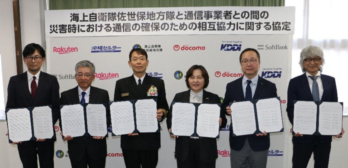 海上自衛隊佐世保地方隊は、NTTドコモ九州支社、KDDI、ソフトバンク、楽天モバイル、沖縄セルラー電話と、災害時の通信確保に向けた相互協力協定を2026年1月20日に結びました。平時から連絡体制を整え、定期的な共同訓練も行い、災害時のライフライン復旧を早める狙いです。