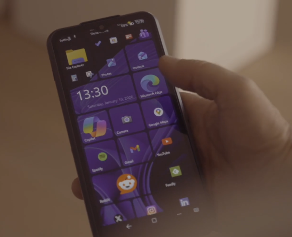 NexPhoneは小さな画面でも操作しやすいよう、Windows 11にタイル風の独自ランチャーを用意し、往年のWindows Phoneのスタート画面を彷彿とさせるUIを採用します。The VergeによるとPWAを使ってモバイル向けUIを自前で構築したそうです。