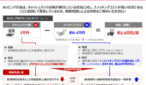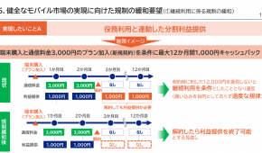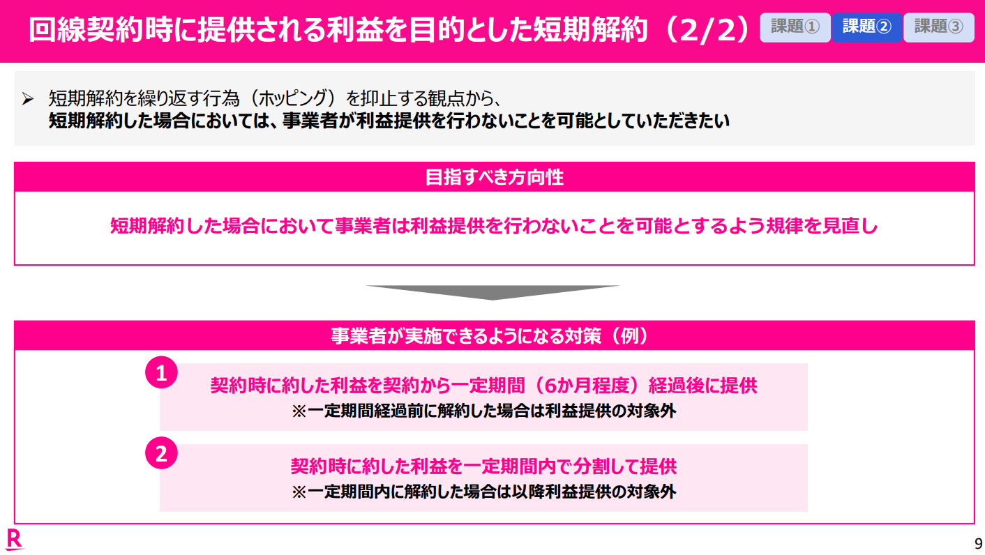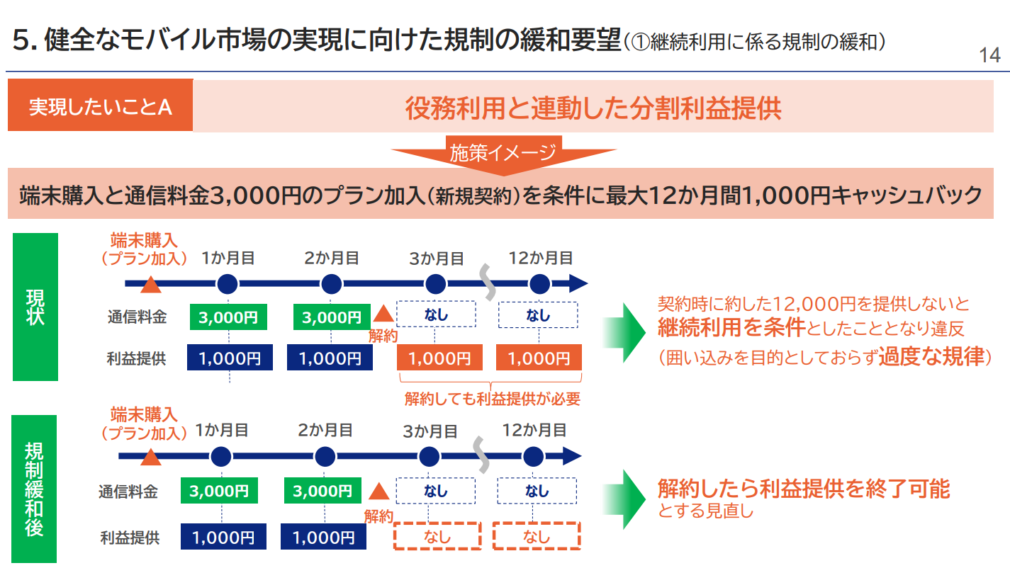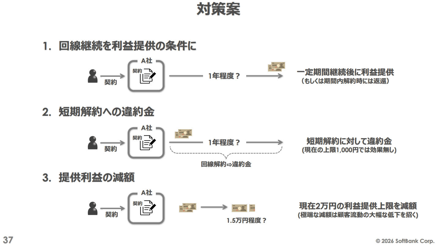 事業者が示した案は大きく2方向です。一つは、短期解約の場合に特典を出さない仕組みを制度として認めることです。例えば、契約時に約束した特典を数ヶ月経過後に渡す、あるいは一定期間に分割して渡し、途中解約なら残りを打ち切るといううもの。もう一つは、継続利用を条件にできない現行ルールが「先払いの特典競争」を招くとして、継続利用条件の一部解禁を求める声です。