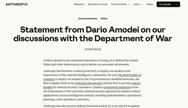 AI企業Anthropicのダリオ・アモデイCEOは2月26日、米国防総省(通称ペンタゴン、戦争省)が求めるAIモデル「Claude」の軍事利用に関する制約撤廃について、要求拒否を表明しました。CBS Newsなど複数の米メディアが伝えています。