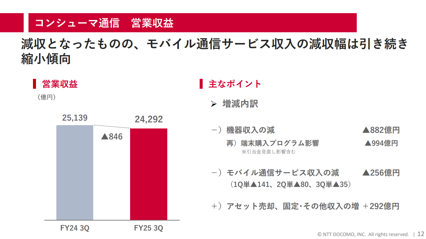 通信サービス自体の収益も厳しい状況です。モバイル通信サービス収入は256億円の減収となりました。四半期ごとの減収幅は縮小傾向にあるものの、依然として前年を下回っています。