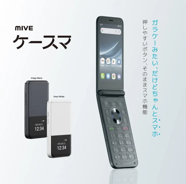 MIVEケースマは、ガラケーを思わせる折りたたみボディに物理テンキーを搭載したAndroidスマートフォン。LINEを使いたいシニア層を想定します。