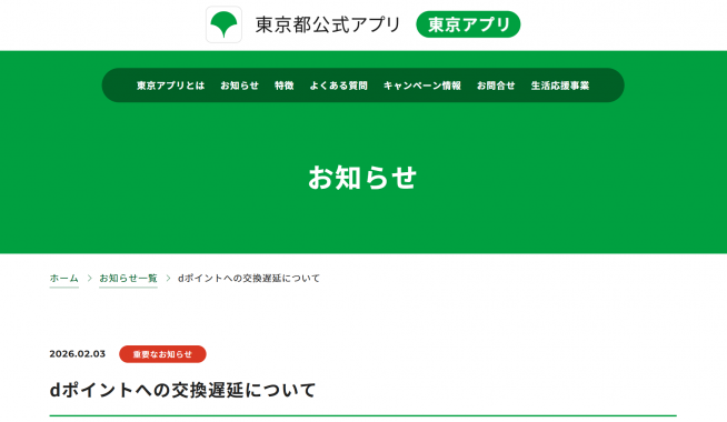 東京アプリの公式サイトは2月3日、dポイントへの交換手続きが一部しにくい状況だと伝え、時間をおいて試すよう案内しています。