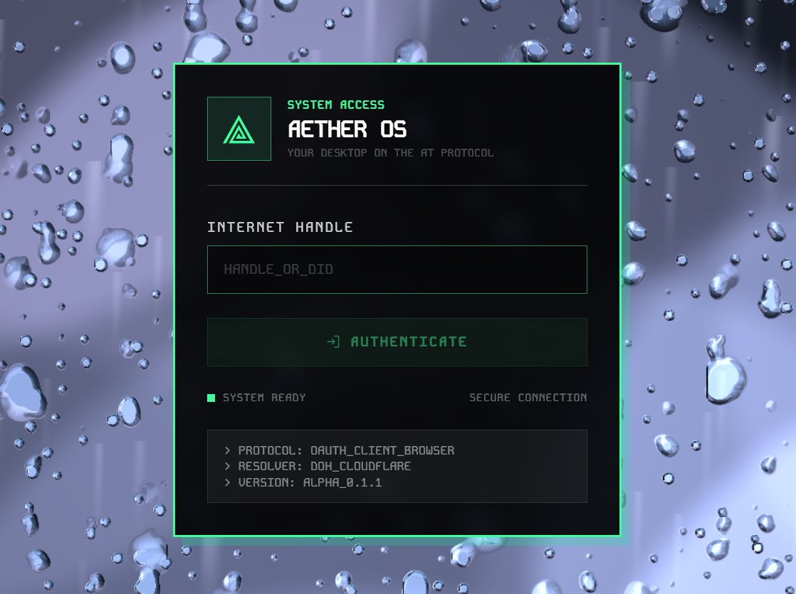 「Aether OS」は、ブラウザ上で動作するデスクトップ環境です。ユーザーはBlueskyアカウントで認証し、AT Protocol上の公開レコードと結びついた形で、ブラウザ内のコンピューティング環境を利用できます。Aether OS側も、自らをAT Protocolにネイティブに構築されたWeb OSとして紹介しています。