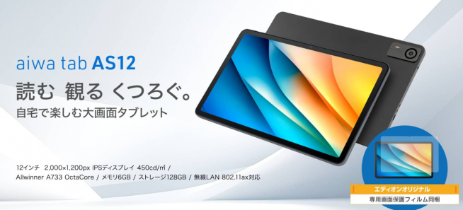 アイワ(アイワマーケティングジャパン)が、12型Androidタブレット「aiwa tab AS12」を2026年2月6日にエディオンで発売しました。エディオン向けに開発したオリジナル仕様モデルで、エディオンネットショップでの価格は2万9800円(税込)です。