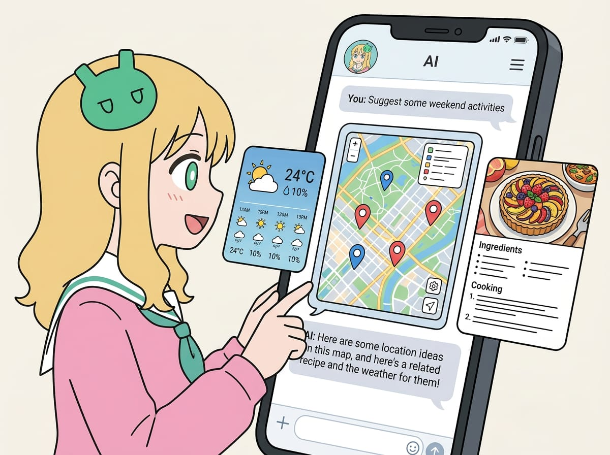 地図だけでなく、天気予報やレシピのビジュアル表示にも対応。旅行計画の場面では、予算帯の選択やアクティビティの複数選択、「コスト」「快適さ」「ロケーション」の優先順位づけといったインタラクティブ入力が表示されることもあるとのこと。ウェブとデスクトップのUIは日本語を含む複数言語に対応済みです。なお天気やレシピのビジュアル表示はウェブ・デスクトップ向けで、モバイルではテキスト表示になります。