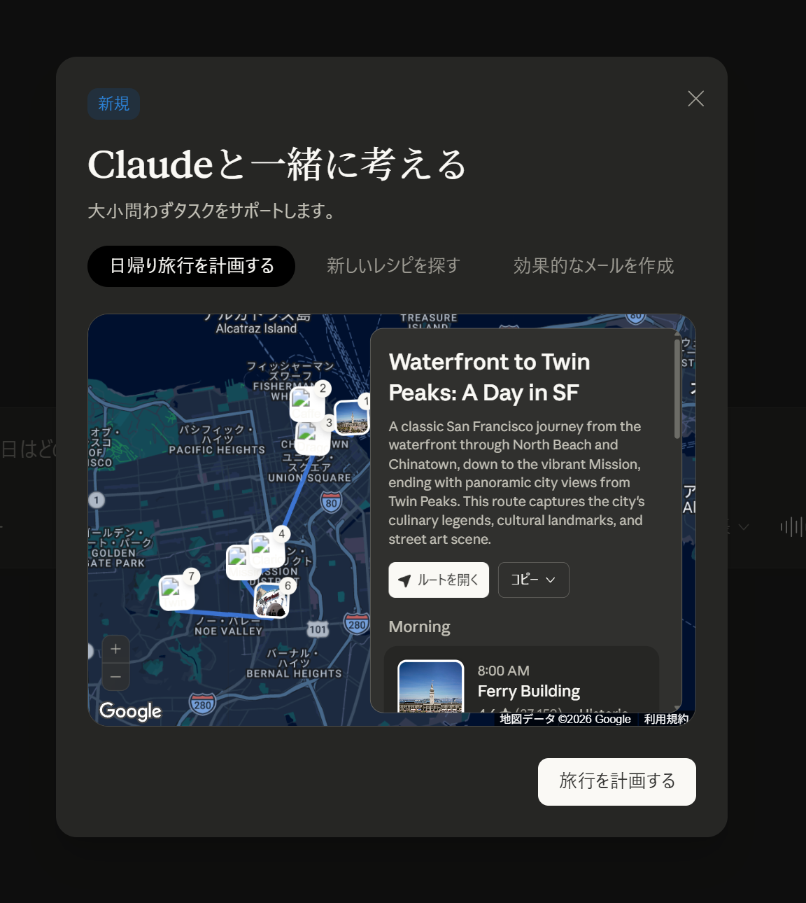 AnthropicのAIアシスタント「Claude」が、Google マップベースの地図表示に対応しました。ウェブ検索を有効にして場所について聞くと、チャット画面にインタラクティブな地図が出てくることがあります。ピンをクリックすれば経路案内や連絡先、画像リンクなども確認できます。