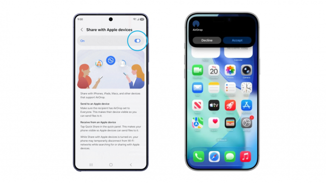 Samsungは、Android端末向けに提供されているファイル共有機能「Quick Share」において、Samsung製端末に搭載されている同機能が、Apple製品向けファイル共有機能「AirDrop」との送受信に対応することを正式発表しました。