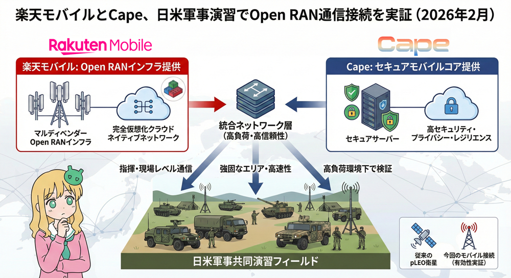 楽天モバイルとCapeは2026年2月25日、日米軍事共同演習でモバイル通信接続の有効性を実証したと発表しました。楽天モバイルが展開するOpen RAN対応の完全仮想化クラウドネイティブモバイルネットワークを介し、セキュリティやプライバシー、レジリエンスといった機能を備えたCapeのモバイルコアネットワークに接続し、要件の厳しい運用環境下で検証したそうです。