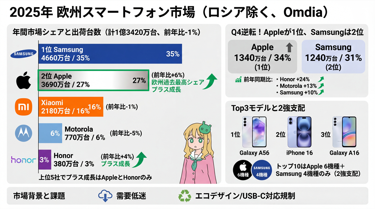 調査会社Omdiaのデータによると、2025年の欧州(ロシアを除く)スマートフォン市場でSamsungが年間出荷台数4660万台、シェア35%で首位を維持しました。