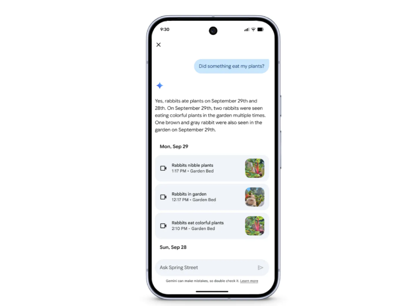 「Homeに相談」を使えば自然な言葉で数日分の動画履歴を検索可能。スピーカーやディスプレイに話しかけるほか、Google Homeアプリでテキスト入力でも確認できます。「植物を何かに食べられた?」と尋ねるだけで、関連する映像クリップが表示。自宅監視用途にぴったりですね。