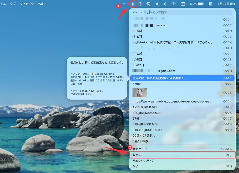 初期設定等は特に必要ないため、入れた状態の設定でも問題ありませんが、より使いやすくするために、最初に行なっておいた方が良い設定をいくつかご紹介します。なお、設定画面は、メニューバーのMaccyアイコン→「設定」から開くことができます。