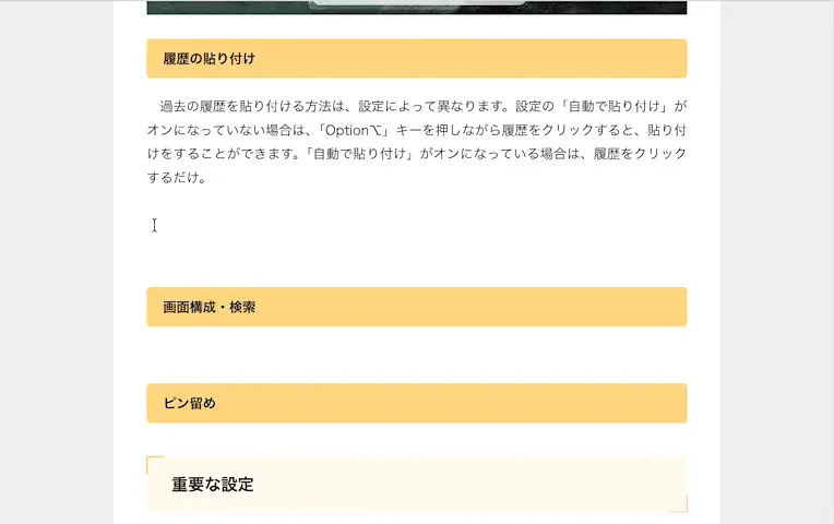 過去の履歴を貼り付ける方法は、設定によって異なります。初期設定の場合は、「Option⌥」キーを押しながら履歴をクリックすると貼り付けをすることができます。設定の「自動で貼り付け」がオンになっている場合は、履歴をクリックするだけ。基本的にはオンにしておくことをお勧めします。