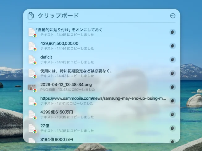 Windowsでは、Windows 10から同様の機能が標準で搭載されており、「Windows + V」のショートカットで「クリップボードの履歴」を呼び出すことができます。Macにおいても、macOS Tahoeからようやく、クリップボードのスナップショット機能が標準で提供されるようになりました。ただ、一度Spotlight(Command ⌘ + スペースキー)を開いてから、さらに「Command ⌘ + 4」を押さなければならず、かつショートカットの変更もできないため、便利とは言い難いのが現状。