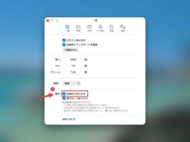 ここだけは必ず設定しておいてほしい項目を先に紹介しておきます。使用する前に、必ずMaccy設定の「一般」→「動作:自動的に貼り付け」にチェックを入れておいてください。