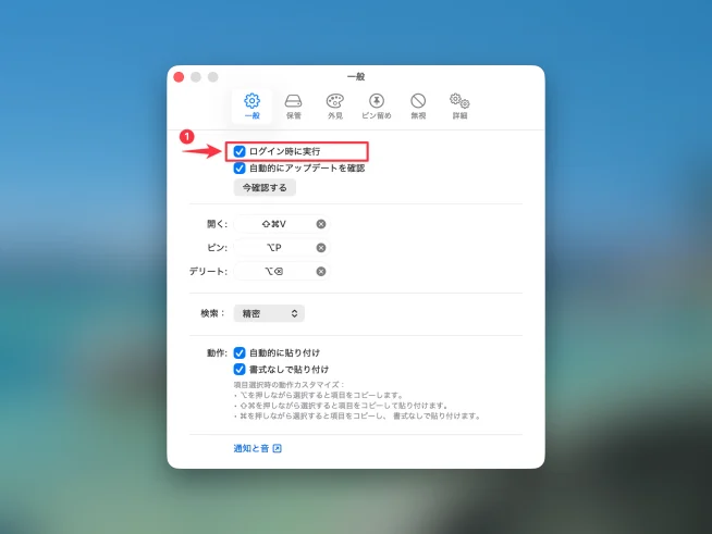 そんな時は、Maccyの設定から「一般」→「ログイン時に実行」にチェックを入れておきます。これだけで、Macを立ち上げれば自動でMaccyが起動するようになります。