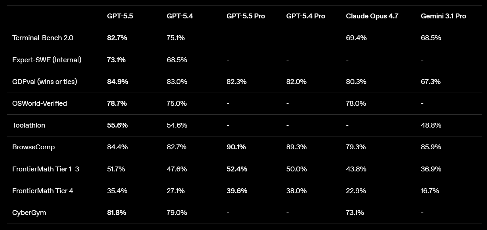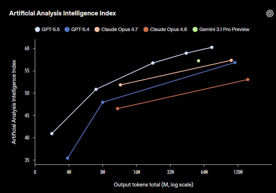 一方で、APIの予定価格はGPT-5.4の2倍になりました。入力が100万トークンあたり5ドル(従来2.5ドル)、出力が同30ドル(従来15ドル)です。OpenAIは本モデルを「最も賢く、直感的に使えるモデル」と説明し、Greg Brockman社長も、GPT-5.5は5.4より少ないトークンで速く鋭く考えられるモデルだと強調しました。なお、OpenAIはGoogleのGemini 3.1 ProやAnthropicのClaude Opus 4.7などと比較したベンチマークも示しており、複数の項目で優位を示したとしています。