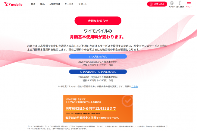 ワイモバイルが月額基本使用料を改定します。シンプル3は6月2日から+220円、旧プランのシンプル/シンプル2は7月1日から+330円。既存契約者にも適用です。